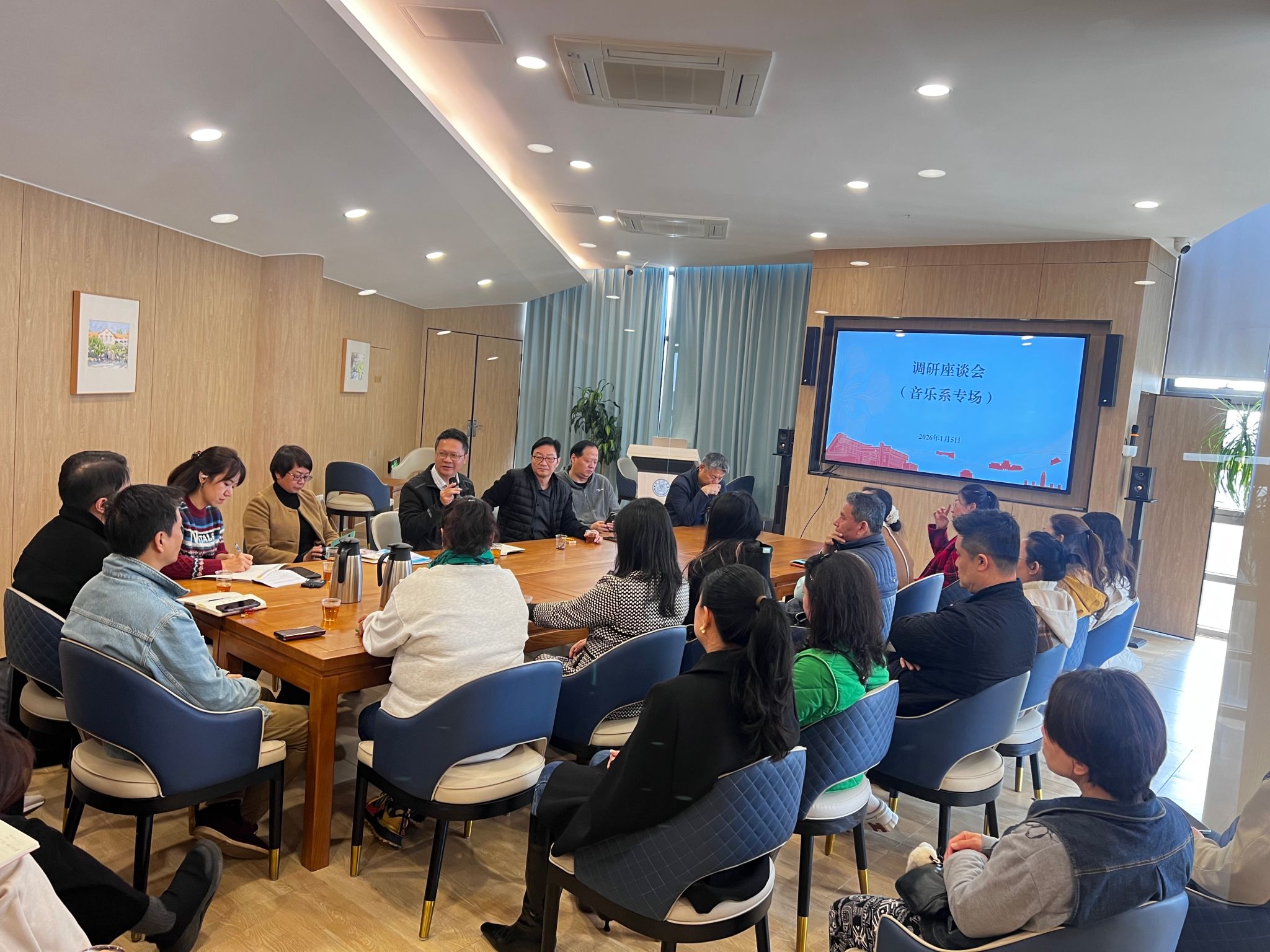 1月5日上午,音乐系调研会召开会上,系主任杨绿荫汇报工作后,院党委书记陈向柳特别对音乐系新年音乐会在繁荣校园文化、提升美育氛围方面的突出成效给予肯定。讨论环节气氛热烈,与会师生就学院班子建设、课程改革、分级教学模式、琴房设施升级、学生管理等具体问题提出建议,并深入探讨了师资队伍建设、专业特色凝练、品牌艺术节筹备及跨学科融合等长远发展课题,为音乐系下一步高质量发展厘清了思路。