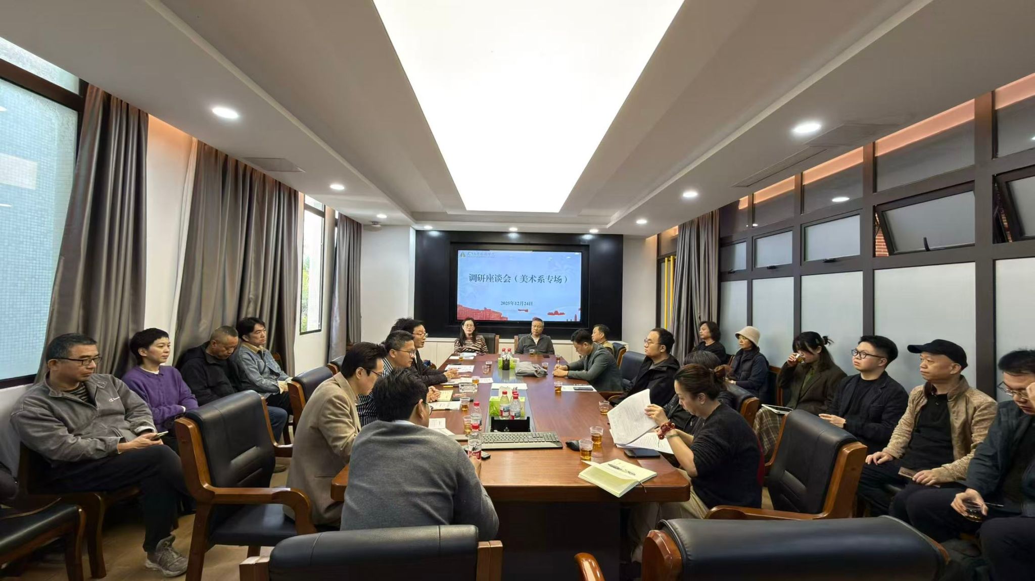 12月24日,美术系调研会召开。会上,系主任方广智作2025年工作报告。院长刘赦着重强调,要紧扣“十五五”规划要求,统筹推进人才培养方案修订、人才引育、教学改革等核心工作。参会教师围绕课程教学优化、学生管理精细化、学风建设深化、学术科研创新等方面各抒己见,为学院党政班子提出意见建议,为美术系学科发展与人才培养建言献策。