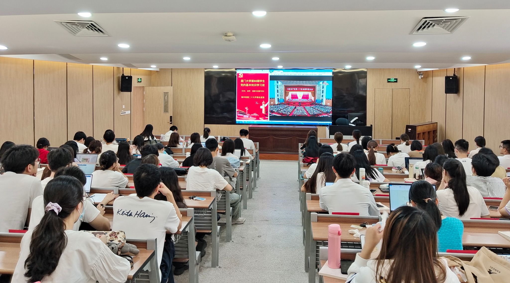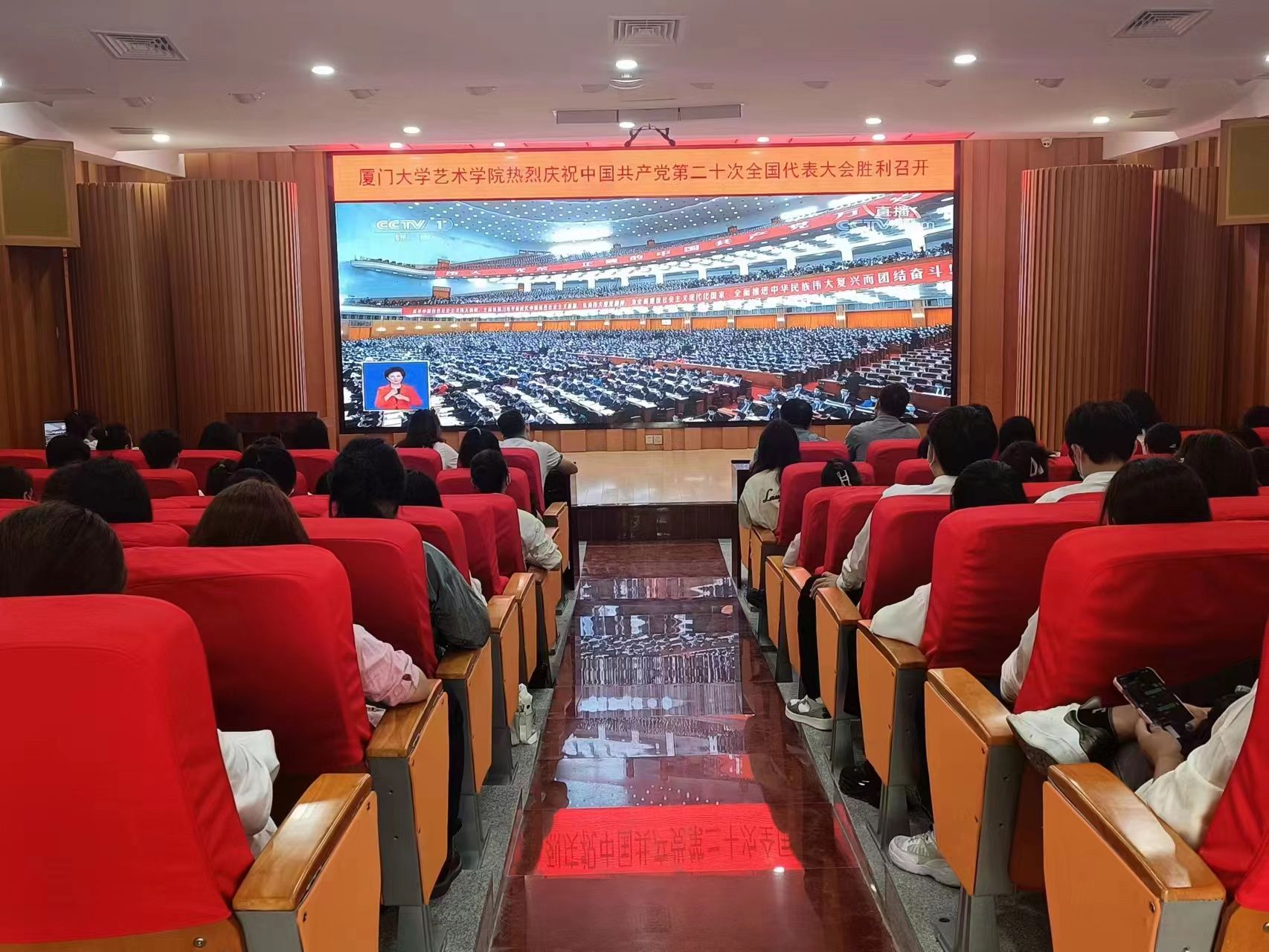 为第一时间学习领会大会精神,艺术学院于小音乐厅、报告厅分别设立集中收看点,院党委书记张必华,党委副书记王艺宏、刘晓峰,副院长杨琳,第88期党的基本知识学习班学员,师生代表等共同收看大会实况直播,喜迎盛会胜利召开。