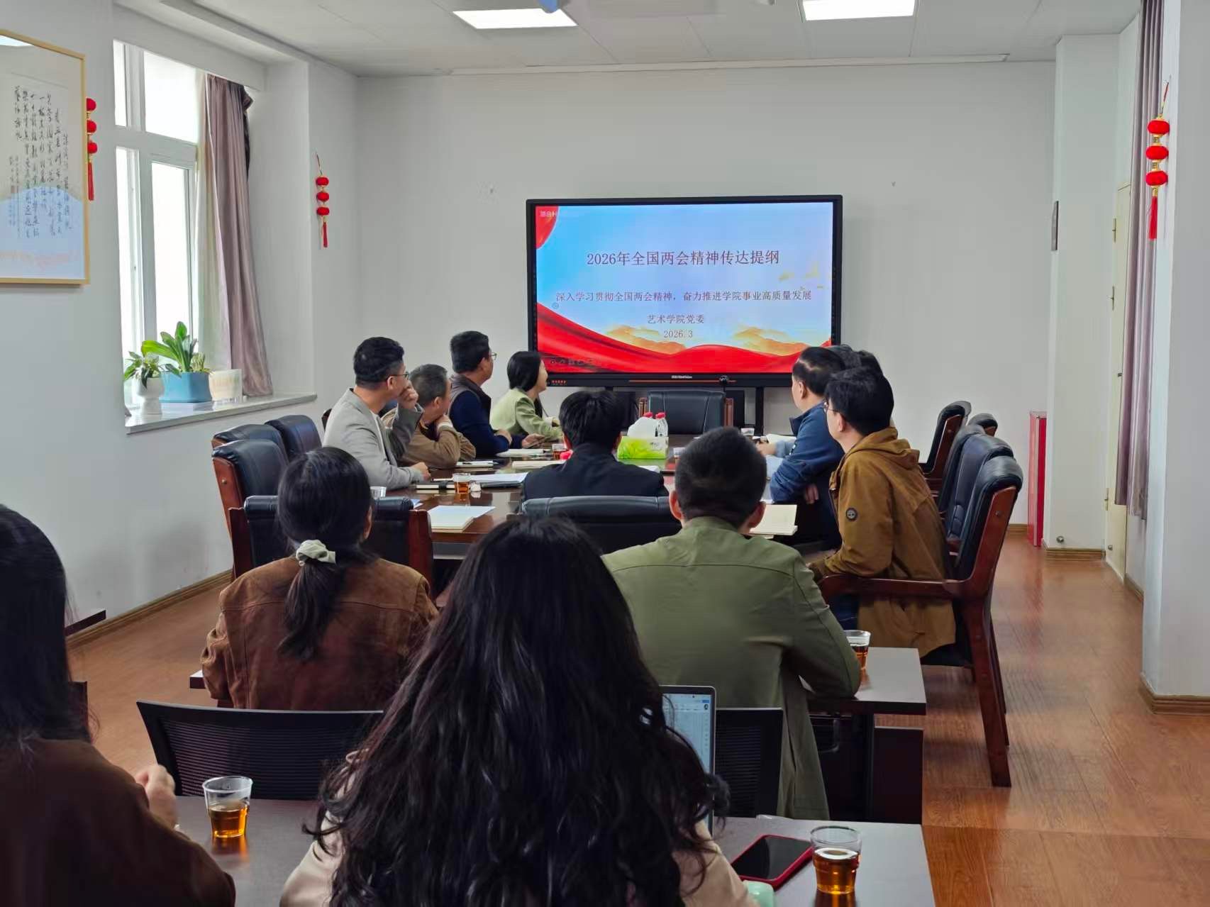 为深入学习贯彻全国两会精神,奋进推进学院事业高质量发展,近日,艺术学院党委召开理论学习中心组(扩大)专题学习会。院党委书记陈向柳主持会议并作领学,院党委副书记王艺宏,党委委员、院办主任李新元等作重点发言。校基层党建联络员郑树东莅临指导,组织员、党支部书记等参加学习。