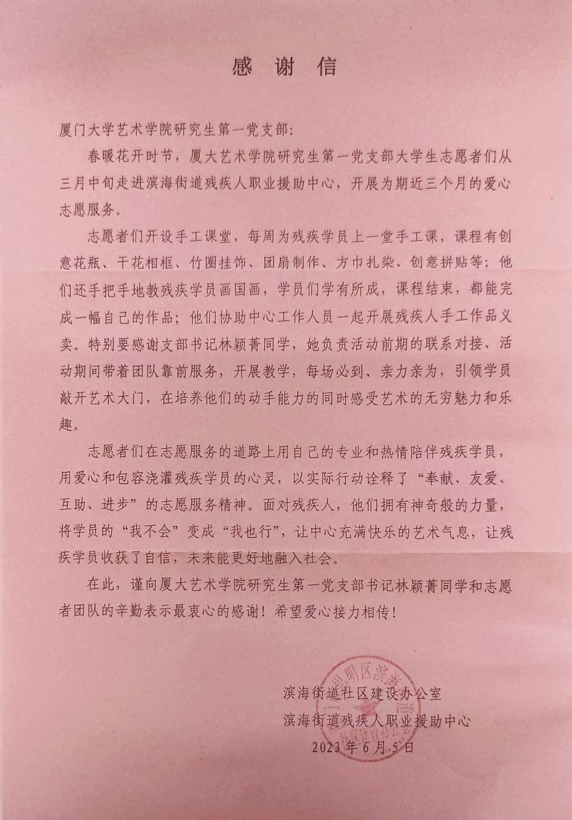 此次活动鼓励残障人士积极参与社会活动,帮助他们重拾生活信心,为感谢艺术学院研究生第一党支部在此期间的辛苦付出,滨海街道社区发来感谢信,极大的鼓舞了支部所有成员。