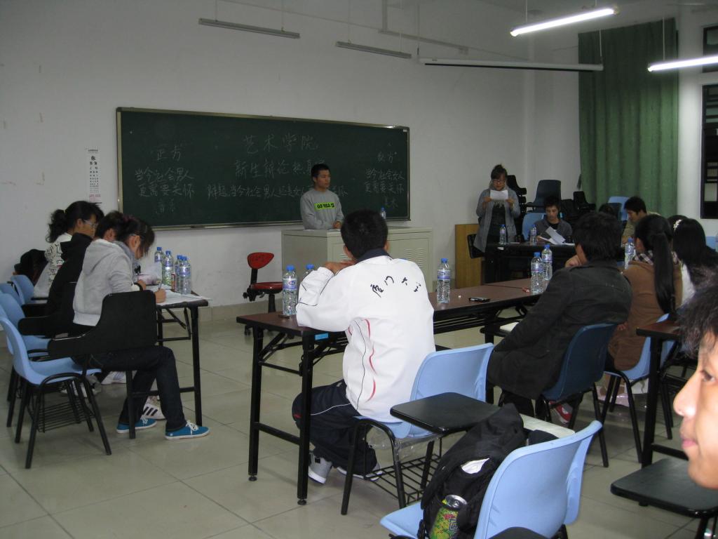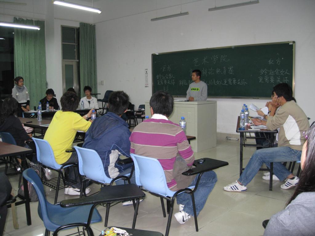 2008年11月19日晚7点,艺术学院2008年新生辩论赛在漳州校区教学楼4#208举行。此次辩论赛中选拔出来的优秀选手将代表我院参加学校2008年新生辩论赛。校区辩论队的队长王瑞瑜及队员们担任评委。