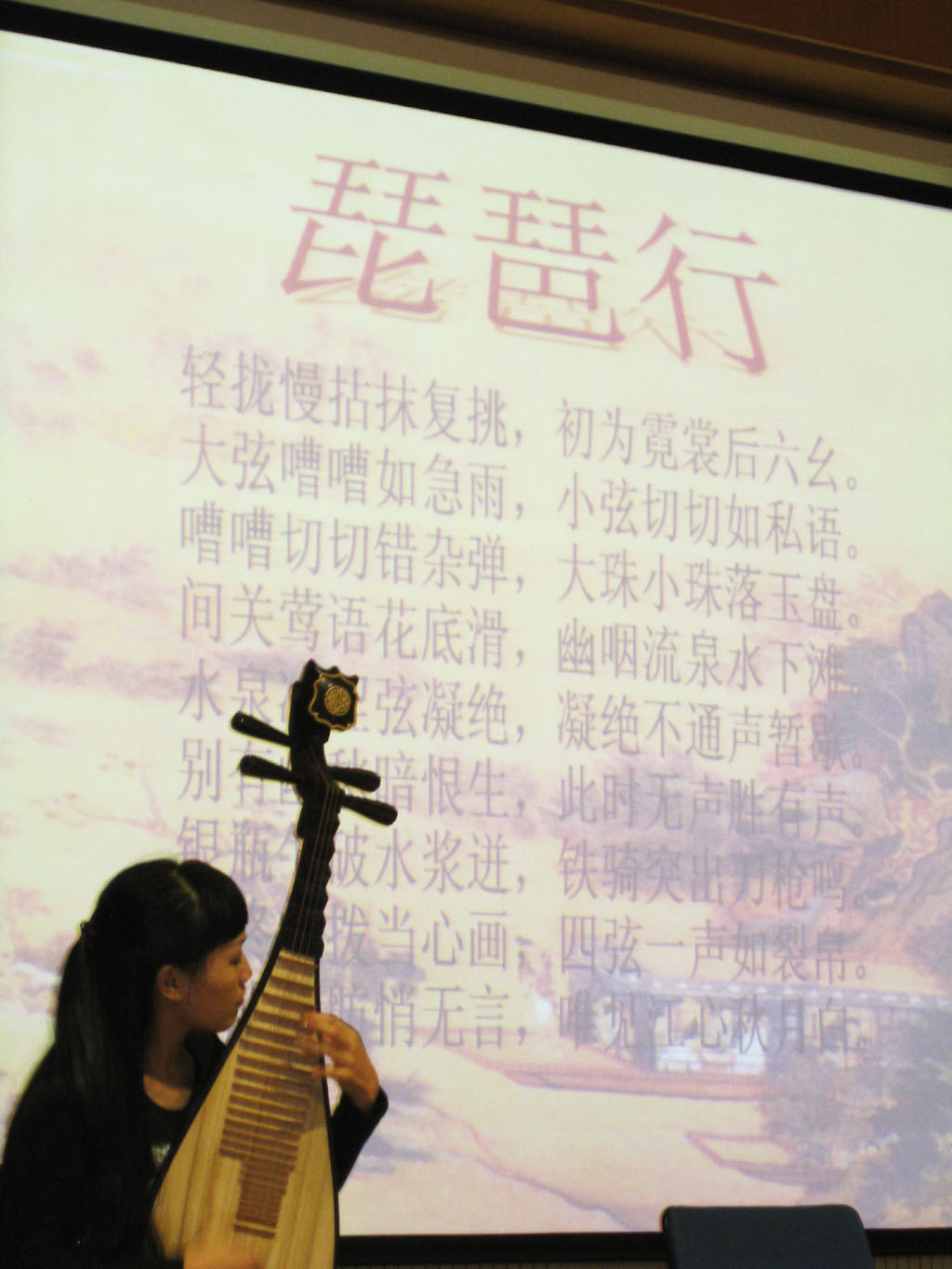 讲座由一曲《琵琶行》开场,全场讲座分为“琵琶与时代”、“琵琶与诗”、“琵琶与人”和“琵琶古今名曲欣赏”四个板块。李老师图文并茂地将琵琶的历史和发展情况介绍给同学们,并由四名同学在现场演奏了《彝族舞曲》和《蓉城姑娘》等一些经典的琵琶名曲,俨然是一场琵琶乐的饕餮盛宴。最后,李昆丽老师结合电影画面,亲自为大家弹奏了一曲《十面埋伏》,高超的演奏技巧和精彩的演绎,让观众们惊叹不已,响起阵阵掌声。