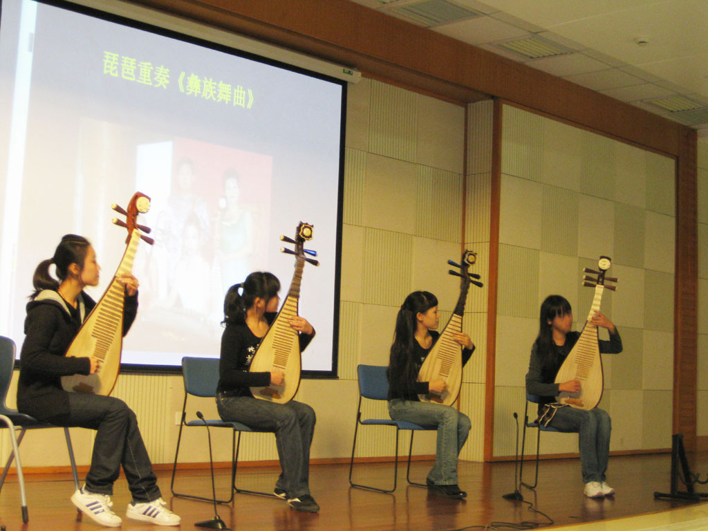12月22日,在漳州校区小报告厅举行的一场“琵琶行”民族乐器专场讲座拉开了2008—2009学年艺术学院高雅艺术进校园系列活动的序幕。艺术学院党委副书记李招淡老师,艺术学院辅导员张宇斌老师与各院系的同学们一同感受了琵琶的魅力。