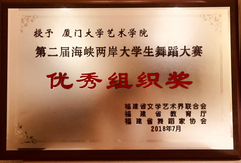 7月15日至7月17日,第二届海峡两岸大学生舞蹈大赛在福州举行,此次大赛共吸引来自海峡两岸30多所高校的80个舞蹈节目参加。我院选送的由李娜教授、青年教师欧锐创作的原创群舞作品《心升》荣获“组委会大奖”(专业组最高奖)、表演银奖、创作银奖,厦大艺术学院荣获优秀组织奖。