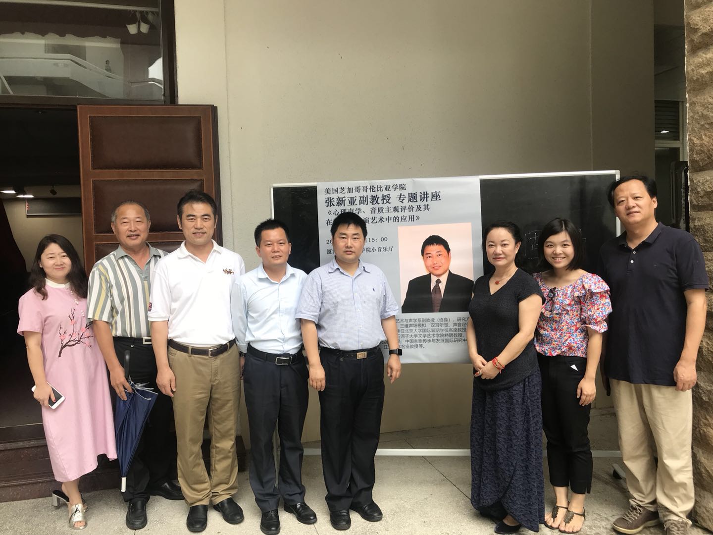 2018年6月19日下午,艺术学院小音乐厅迎来了一场高水平讲座,讲座由音乐系副主任段永纯主持,艺术学院副院长赵艳芳、党委副书记邹江涛、音乐系主任陈言放、声乐教研室主任刘涛等领导和音乐系师生出席了讲座。讲座主讲人张新亚副教授是来自美国芝加哥哥伦比亚学院音频艺术与声学系副教授。他的研究方向为心理声学、建筑声学、虚拟现实、三维声场模拟、双耳听觉、声音定位、媒体艺术、录音、人声与歌唱等。兼任北京大学国际暑期学校客座教授、石河子大学文学艺术学院特聘教授、中国国家文化发展国际战略研究院研究员、中国京剧传承与发展国际研究中心研究员等。