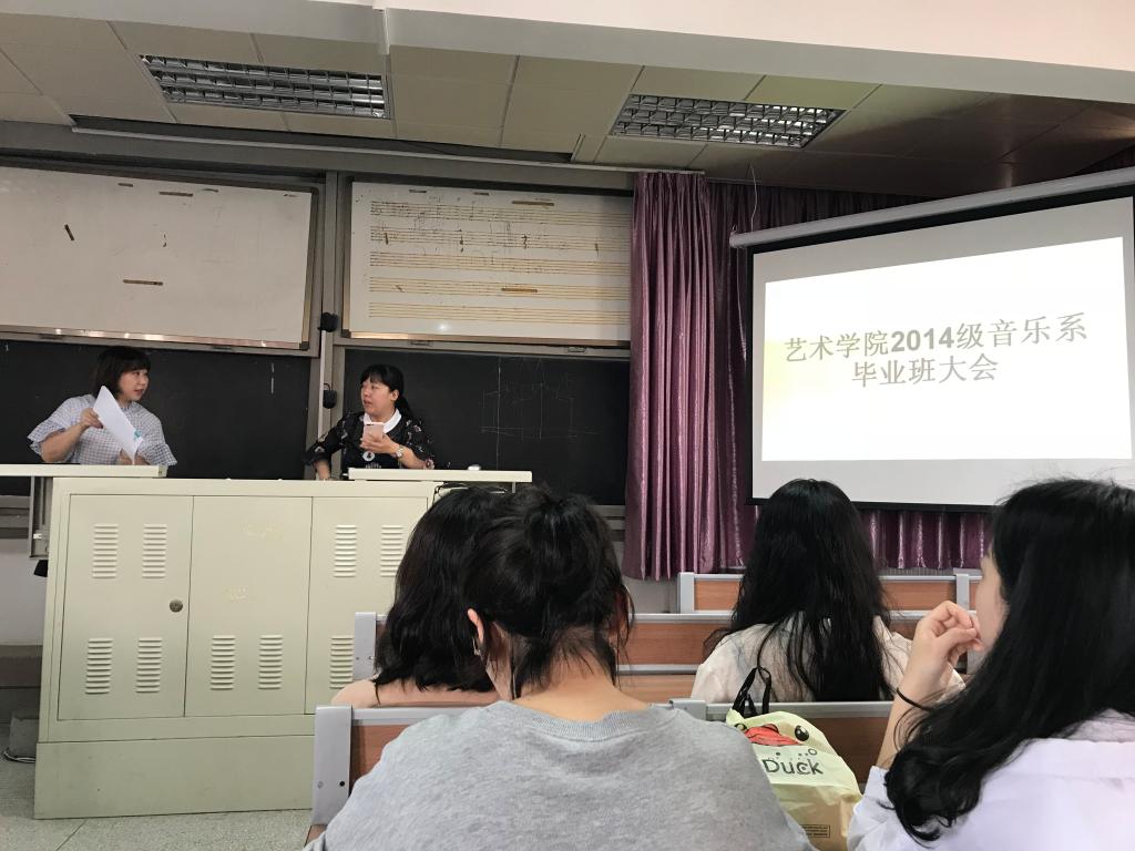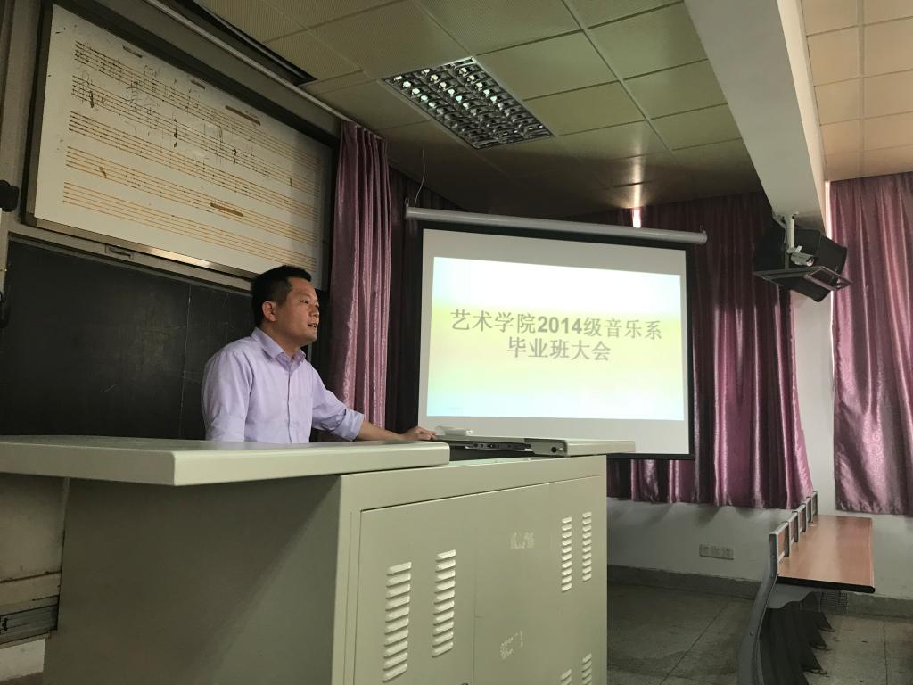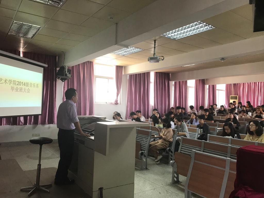 2018年4月4日上午,艺术学院音乐系2014级毕业班大会在艺术学院三楼阶梯教室召开。学院党委副书记邹江涛老师、2014级音乐系辅导员王亚群老师、教学秘书陈倩妮老师,2014级音乐系全体本科生参加了此次会议。会议由王亚群老师主持。
