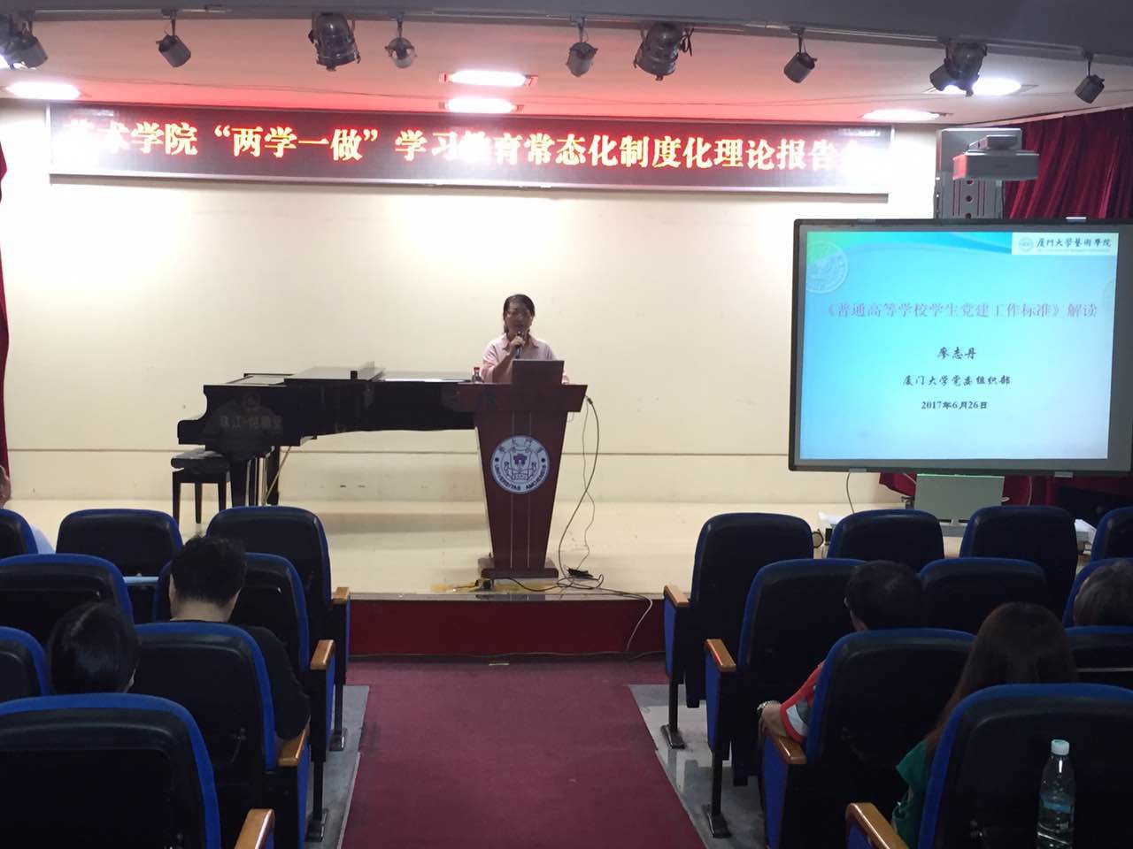 6月26日下午,由艺术学院党委党校主办的“两学一做”学习教育常态化制度化理论报告会邀请到校党委组织部副部长廖志丹副教授来学院作《普通高等学校学生党建工作标准》解读讲座,参加讲座的有院党委书记何元赞、党委委员、教工党支部书记、政工口干部和全体学生党员。讲座由院党委副书记邹江涛主持。