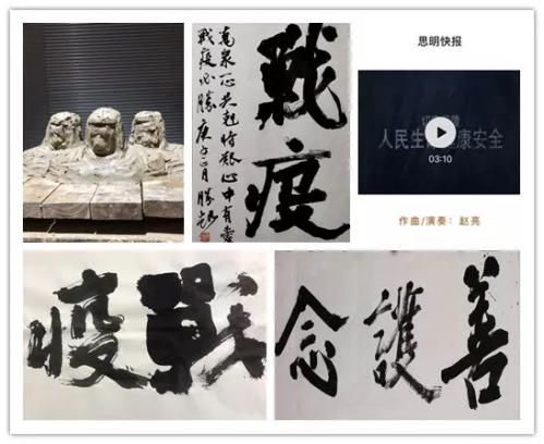艺术学院常务副院长、教授吴荣华带头投身专题创作,雕塑作品《火神山》展示了医护人员用自己的血肉之躯筑起阻击病毒的坚实堡垒,表达了对医护工作者的崇高敬意;他创作的书法《戦疫》笔画遒劲有力,彰显出战疫必胜的万丈豪情;艺术学院美术系、设计系教工党支部书记,教授,博士生导师陈胜凯写下“万众一心共克时艰,心中有爱战疫必胜”,表达共抗疫情、共渡难关的决心,他还写下《善護念》提醒师生在疫情当前,谣言满天时明辨是非,擦亮双眼;音乐系教工党支部副书记、青年音乐教师、古埙传承人赵亮创作并演奏的埙曲《忠魂》,委婉的曲调中透出不屈的精神和力量,向仍然战斗在疫情一线的医务工作者和奉献爱心的人士表示敬意,作品还登上思明快报,鼓舞市民朋友的战“疫”士气。