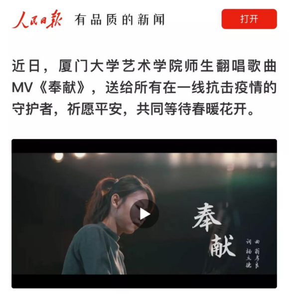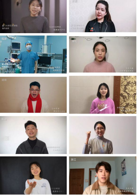 “无论你在哪里,我都要守护你,荆楚大地,东海之滨,虽远隔千里,却始终心连心…”,艺术学院网络文化工作室“TNT燃点”制作MV“全国各地厦大人唱响《生死不离》”,唱出了五湖四海厦大人自强不息、心系天下的宽广胸襟。“离散回乡的人群中,一袭白衣,一腔诚赤,一程逆旅。一如刺破黑暗的白芒,青春战‘疫’ 责无旁贷”,艺术学院学生参与朗诵《青春战“疫”厦大长歌》,句句铿锵,表达了厦大青年筑牢坚实防线,稳健防疫高墙的使命担当。