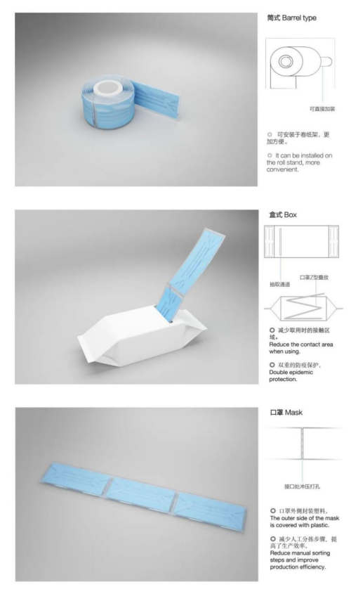 “民用口罩包装方式大体分为统一包装和单个封装,两种包装模式在生产制造过程中需经过大量人工筛查,存在一定感染风险,且包装模式的使用也存在着风险”高子星说,基于以上存在的缺陷,自己设计简化了口罩生产与新式封装流程,极大降低了交叉污染地风险,且更便于运输储备和领取,符合当下和未来防疫要求。新式包装分为卷式与盒式,这两种模式均为条式口罩填充,交界处带有撕剪带便于单个分发,该创意的灵感来源于日常生活中人们常用的卷纸以及抽纸。