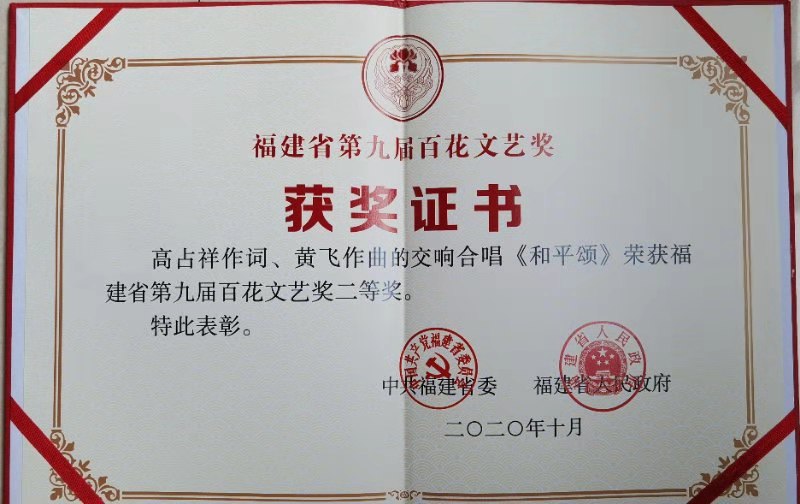 交响合唱《和平颂》由原文化部常务副部长、中共河北省委书记高占祥同志呕心沥血的赋体诗,2005年曾搭乘神舟六号上天遨游太空;厦门大学黄飞副教授将其谱写为一部大型的交响合唱。该曲于2014年6月首演于马来西亚国油音乐厅,2017年,作曲家在此基础上将其作进一步修订,其定稿版本首演于11月13日北京国家大剧院。