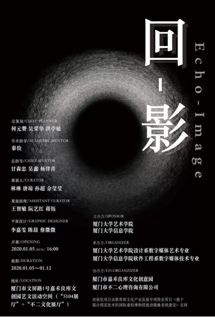本次展览由何元赞、吴荣华 、洪学敏担任总策划;秦俭担任学术指导;甘森忠 、吴鑫 、杨律青担任总指导。展览作品指导老师为林琳、唐琼、朱红、孙超、马文、佘莹莹。林琳、唐琼、孙超、佘莹莹担任策展人;王智敏、阮艺红、蒋钰担任策展助理;李嘉雯、陈晨、詹薇薇完成海报平面设计。“回-影Echo-Image”展览于2020年1月5 日16:00开展。由厦门大学艺术学院和信息学院主办,厦门大学艺术学院设计系数字媒体艺术专业,厦门大学信息学院软件工程系数字媒体技术专业承办,厦门市嘉禾良库文化创意园和厦门市不二心理咨询有限公司协办。该展览项目由教育部文化产业发展专项资金项目《基于混合现实技术的国际虚拟博物馆流动镜像系统建设》支持。