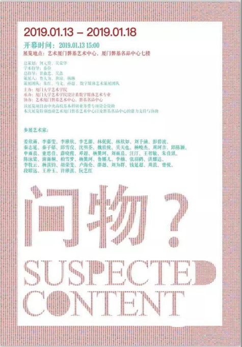 2019年1月13至18日厦门大学艺术学院于艺术厦门磐基艺术中心,厦门磐基名品中心七楼举办专题展览“问物”。
