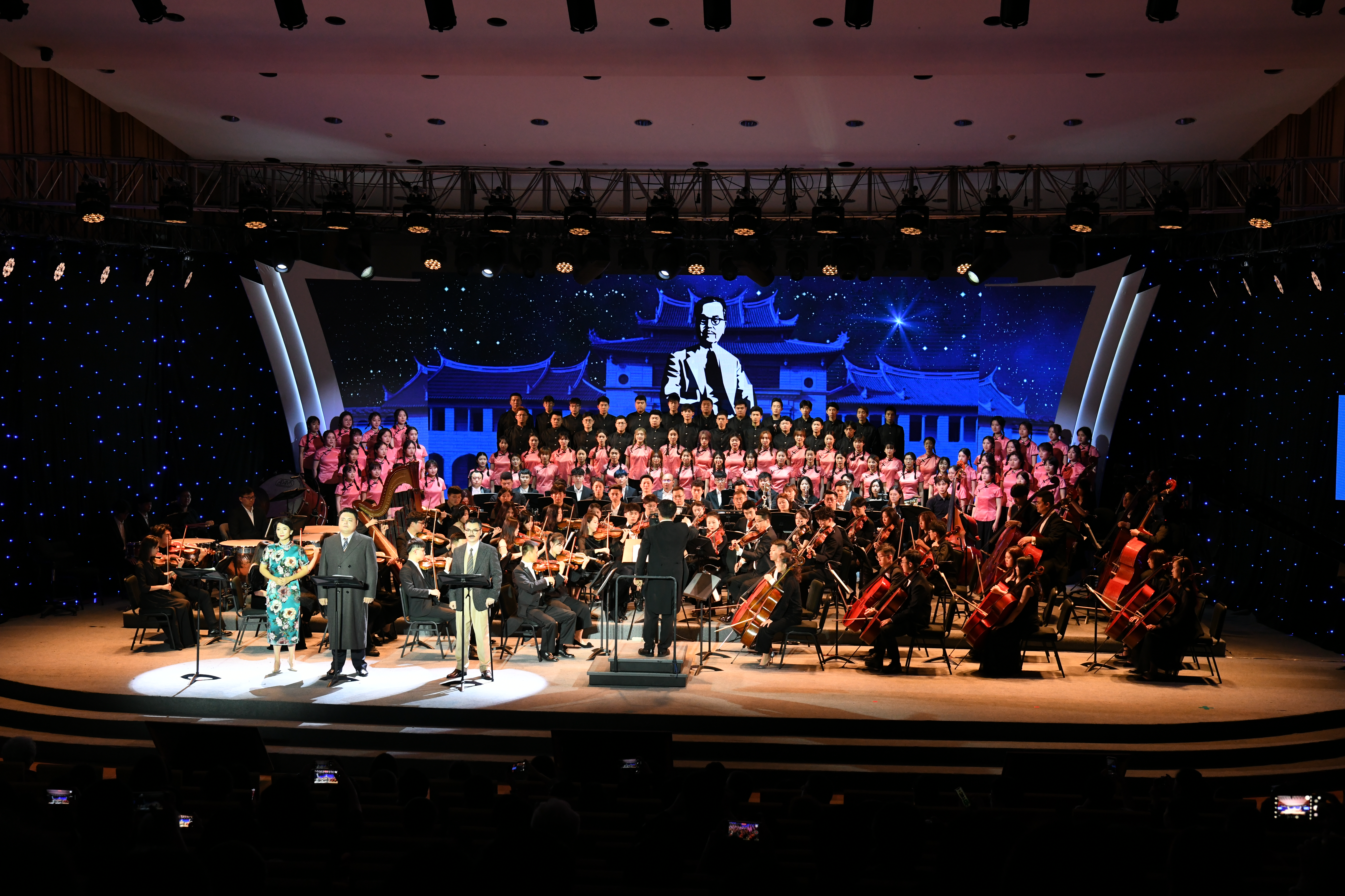 4月3日晚上,百年校庆原创歌剧《陈嘉庚》在科学艺术中心音乐厅首演。校党委书记张彦,校党委副书记徐进功,著名指挥家郑小瑛,校友张复雄、朱德贞伉俪,校友柯希杰、陈毓秀伉俪,《陈嘉庚》编剧余楚杏,《音乐周报》专栏编辑李澄,艺术学院党委书记张必华,艺术学院院长刘赦出席。
