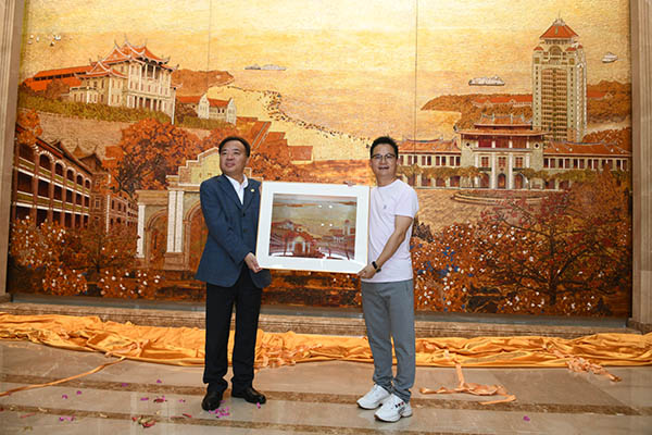 去年9月,游国权为母校捐赠300余万元,用于德旺图书馆壁画创作,成为首批纳入 “厦门大学文化艺术基金”的项目,献礼百年校庆,助力厦大校园文化艺术建设。油画《文明之光》和漆画《世纪南强》分别镶嵌在德旺图书馆南厅和北厅墙壁。《文明之光》以人类历史上具有代表性的文化元素为切入点,画面中的文明之树托起了人类自远古走向未来的阳光之路,也蕴含了“百年厦大、百年树人、根繁叶茂”的美好寓意;《世纪南强》漆画展现了厦门大学思明校区、翔安校区、漳州校区、马来西亚分校的标志性建筑,勾画出厦门大学百年光荣历程。