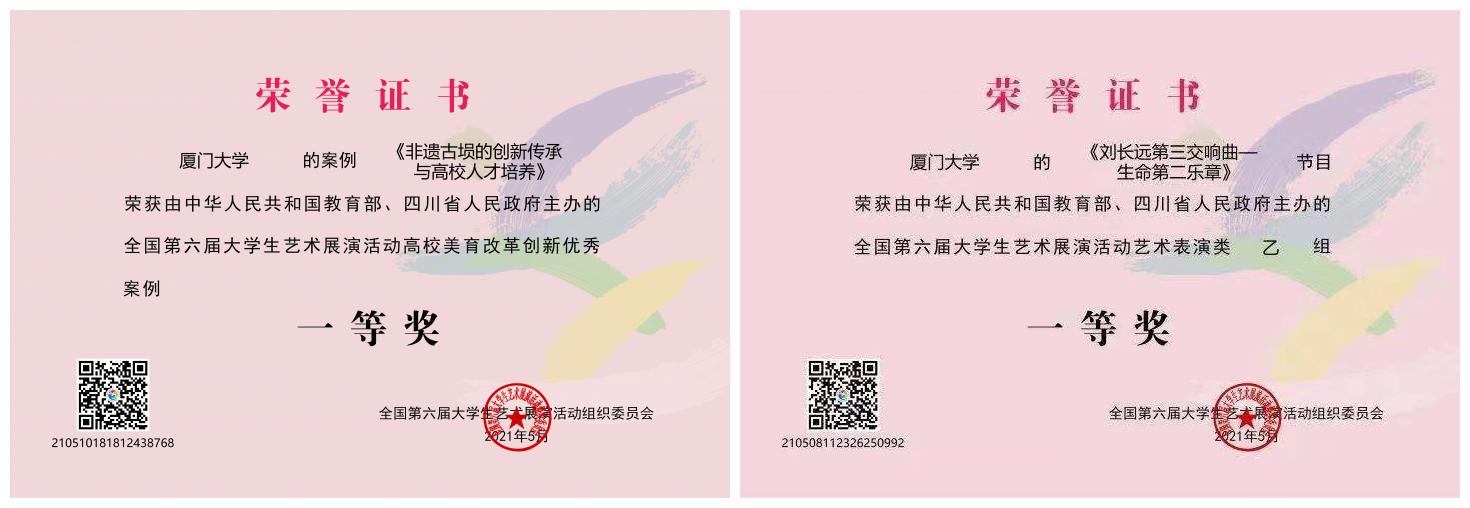 5月12日,第六届全国大学生艺术展演活动在成都圆满落幕。我院入围现场展演的2个项目:器乐作品《刘长远第三交响曲——生命第二乐章》(指挥:黄飞)、美育改革创新优秀案例《非遗古埙的创新传承与高校人才培养》(项目主持人:赵亮)表现亮眼,双双获得全国一等奖。