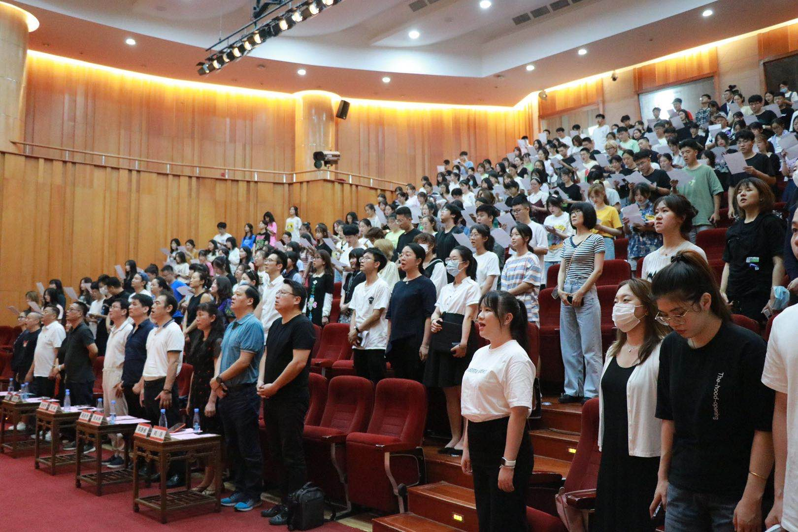 开学式开始前,学院组织校歌教唱,音乐系2019级硕士研究生潘苑担任教员。“自强,自强,学海何洋洋,谁与操钥发其藏?”校歌铿锵有力,饱含深情,催人奋进。新生们在雄伟壮丽的旋律中体会厦门大学深厚的文化底蕴,在激扬壮阔的歌词中感悟厦大人“知无央·爱无疆”的情怀,传承自强不息、止于至善的精神。