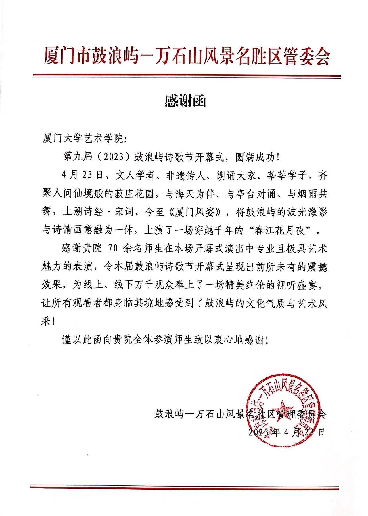 为深入贯彻党的二十大报告“推进文化自信自强,铸就社会主义文化新辉煌”有关精神,助力厦门市打造“文化中心、艺术之城、音乐之岛”,用诗意和音乐再现人民对美好生活的向往,提升城市文化氛围,厦门市鼓浪屿定于2023年4月23日-4月28日举办鼓浪屿品牌活动——第九届鼓浪屿诗歌节,厦门大学艺术学院合唱团、厦门大学艺术学院室内乐团、厦门大学艺术学院舞蹈团及厦⻔大学艺术学院埙演奏老师及箜筷、箫、琵琶演奏学生共60余名师生受邀作为4月23日晚开幕式音乐会重要嘉宾参与演出录制。