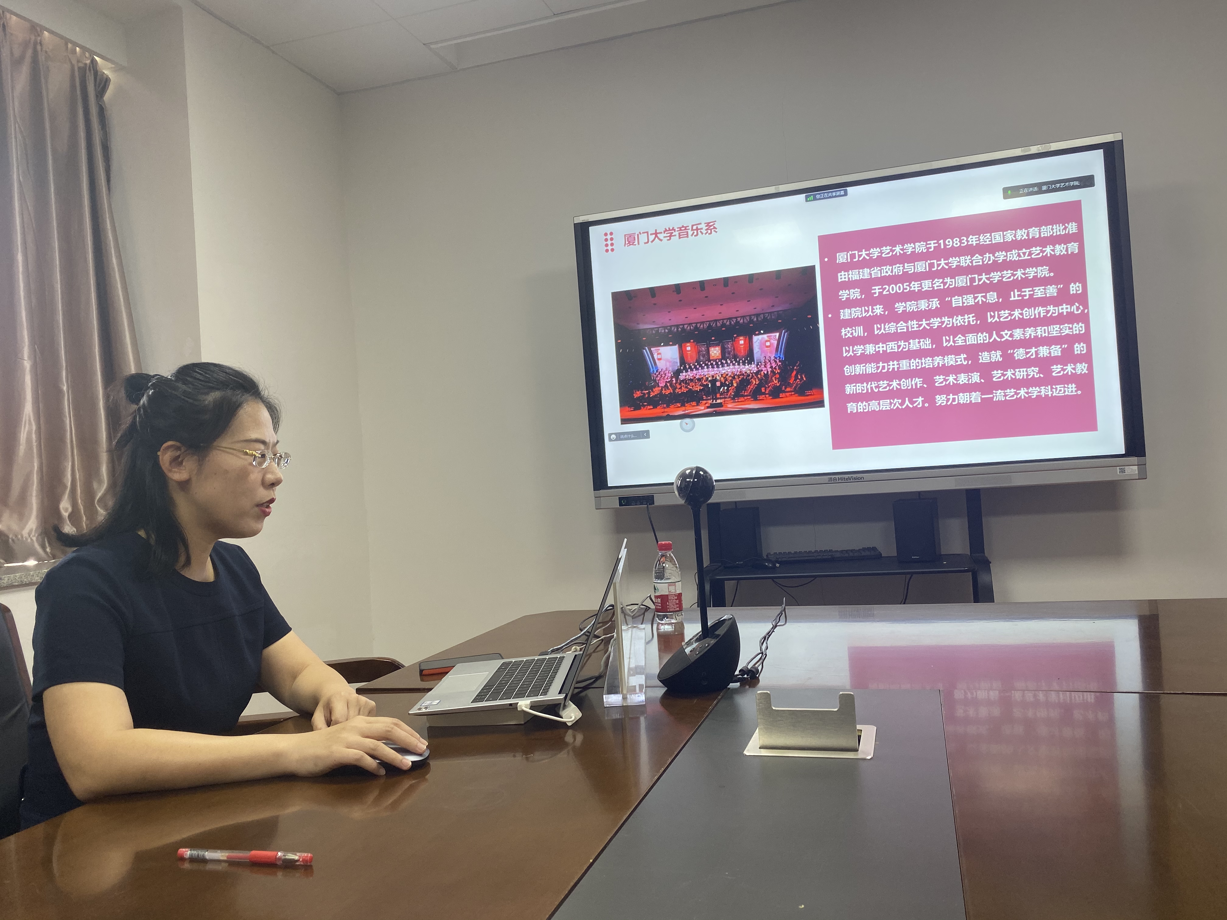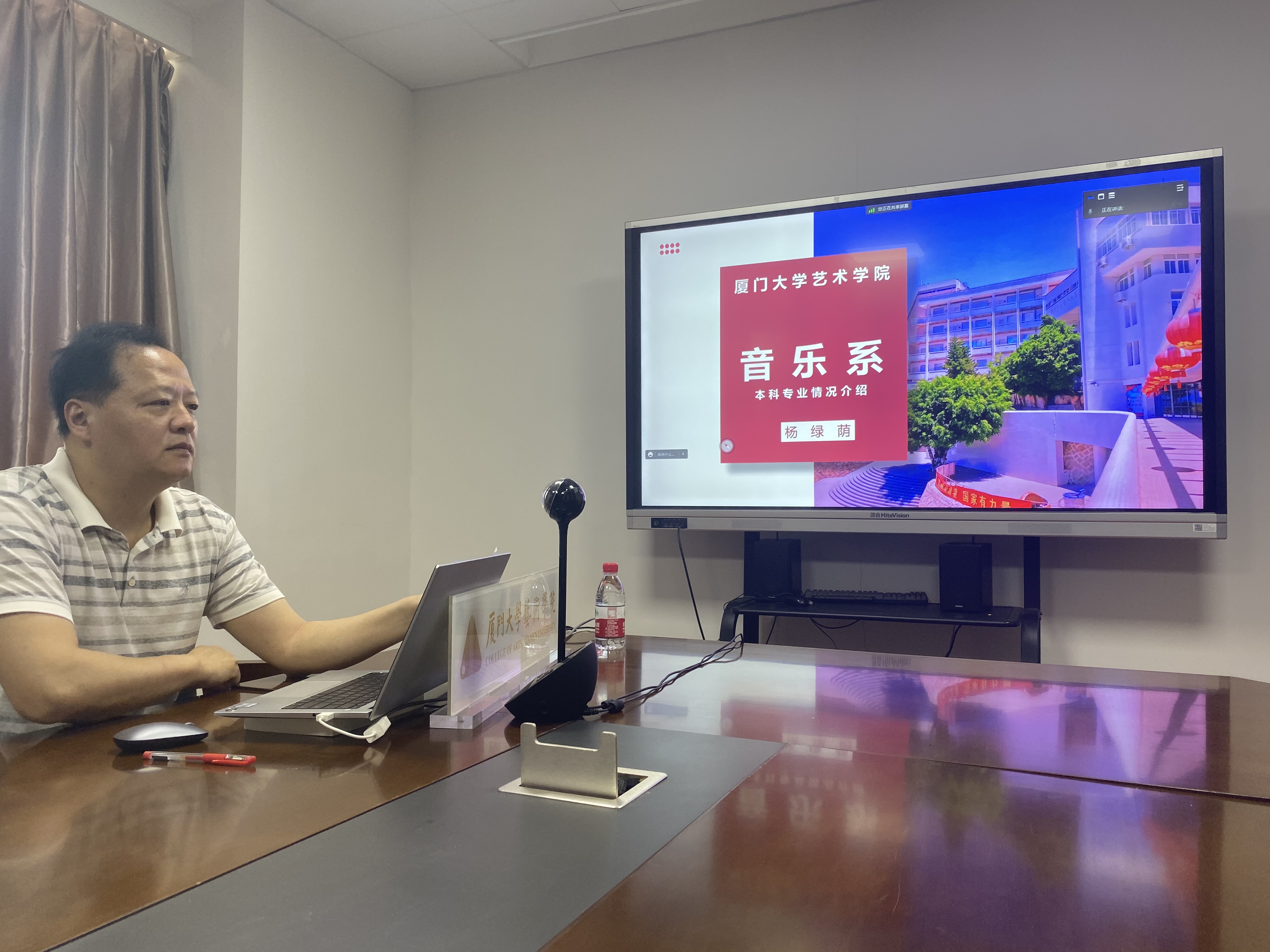 宣讲伊始,刘涛副院长对今天观看直播的学生和家长进行了热烈的欢迎,就艺术学院整体情况做了简单的介绍。紧接着音乐系副主任杨绿荫副教授以图文结合的形式简述了厦大艺术学院与音乐系的发展历程与概况,并从学科简介、专业方向、学科发展优势等几方面深入浅出地介绍了我院音乐系的课程设置、教研室教师构成和各个专业的实践成果。其中,杨绿荫副教授重点突出了音乐系依托厦大这一资源丰厚的母体为学子们带来的充分的国际交流机会与本土艺术文化研究平台的优势,鼓励同学们根据自己的实际情况和兴趣选择适合自己的专业方向。