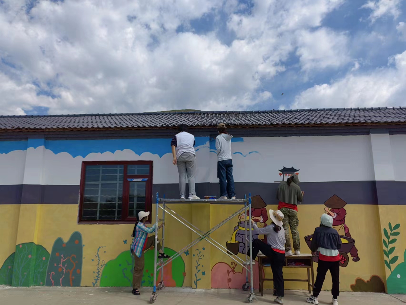 在随后的10余天时间里,实践队或是头顶烈日或是淋着秋雨,抓紧宝贵的实践时间推进墙绘创作。大家一手托调色盘,一手执绘画笔,合力将总计近400平方米的粗糙墙面改造为色彩斑斓、内容丰富、艺术氛围浓郁的杨河乡文化展示“画廊”,充分展现了杨河乡的产业优势和民风风俗,形成独具隆德特色的文化名片。