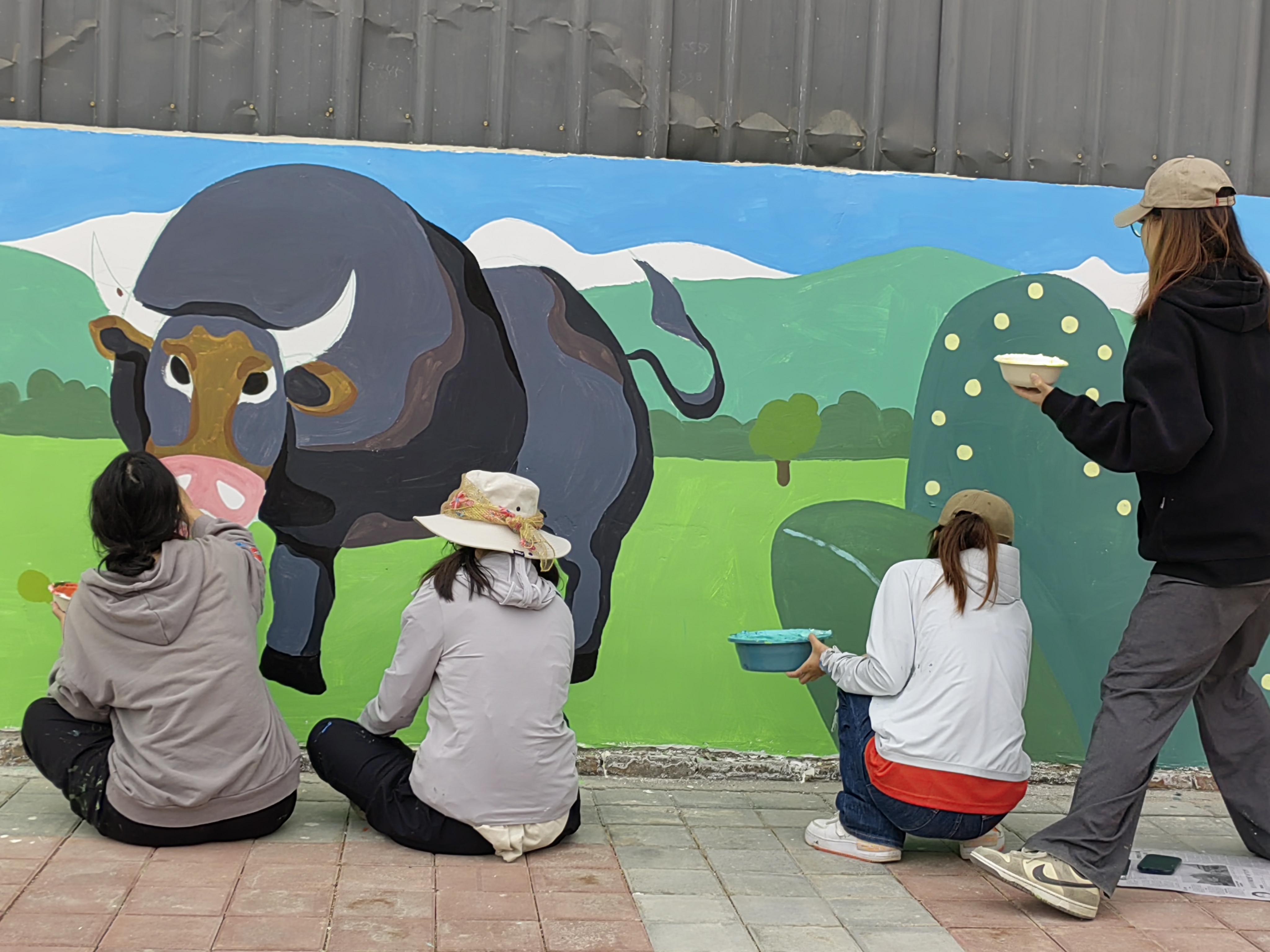 一笔一画显真意,一墙一壁皆文化。近年来,艺术学院在省内外开展了一系列颇具特色的艺术墙绘创作,深受群众喜爱。隆德县杨河村文化广场是广大村民进行文体活动的首选之地,串河村肉牛养殖基地是当地近年兴起的以肉牛产业带动经济发展和农民增收示范区。这几处便被选为墙绘创作地。为了准确完美地展示当地新时代农业农村新风貌,实践队前期反复和当地负责人交流、沟通设计草稿。抵达实践地后,实践队员们在带队老师的指导下,进行现场勘测、充分讨论、修改设计,确定了“文化兴农-树文明新风”“产业富农-做强牛产业”“合作助农-做大集体经济”三幅墙绘主题。
