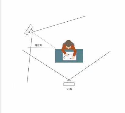 2. 准备好双机位(摄像头)复试设备,“第一机位”用于采集考生音、视频源(考生正前方),要求清晰拍摄到完整的考试桌面和考生上半身,考生将手放置于桌面上,不得离开摄像头。“第二机位”用于采集考生所处的环境(远端),主要放置于考生背后,要开启静音模式,要求能够监控考生的周边情况以及“第一机位”显示器的音、视频源。双机位摆放图如下: