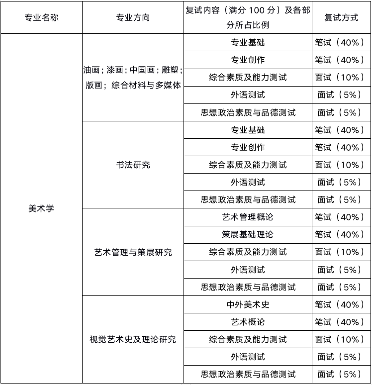 2.考生按美术学绘画(油画、漆画、中国画、雕塑与公共空间艺术、书法研究、版画研究、综合材料与多媒体)以总成绩从高分到低分排名。视觉艺术史及理论研究和艺术管理与策展研究分别以总成绩从高分到低分分别排名。