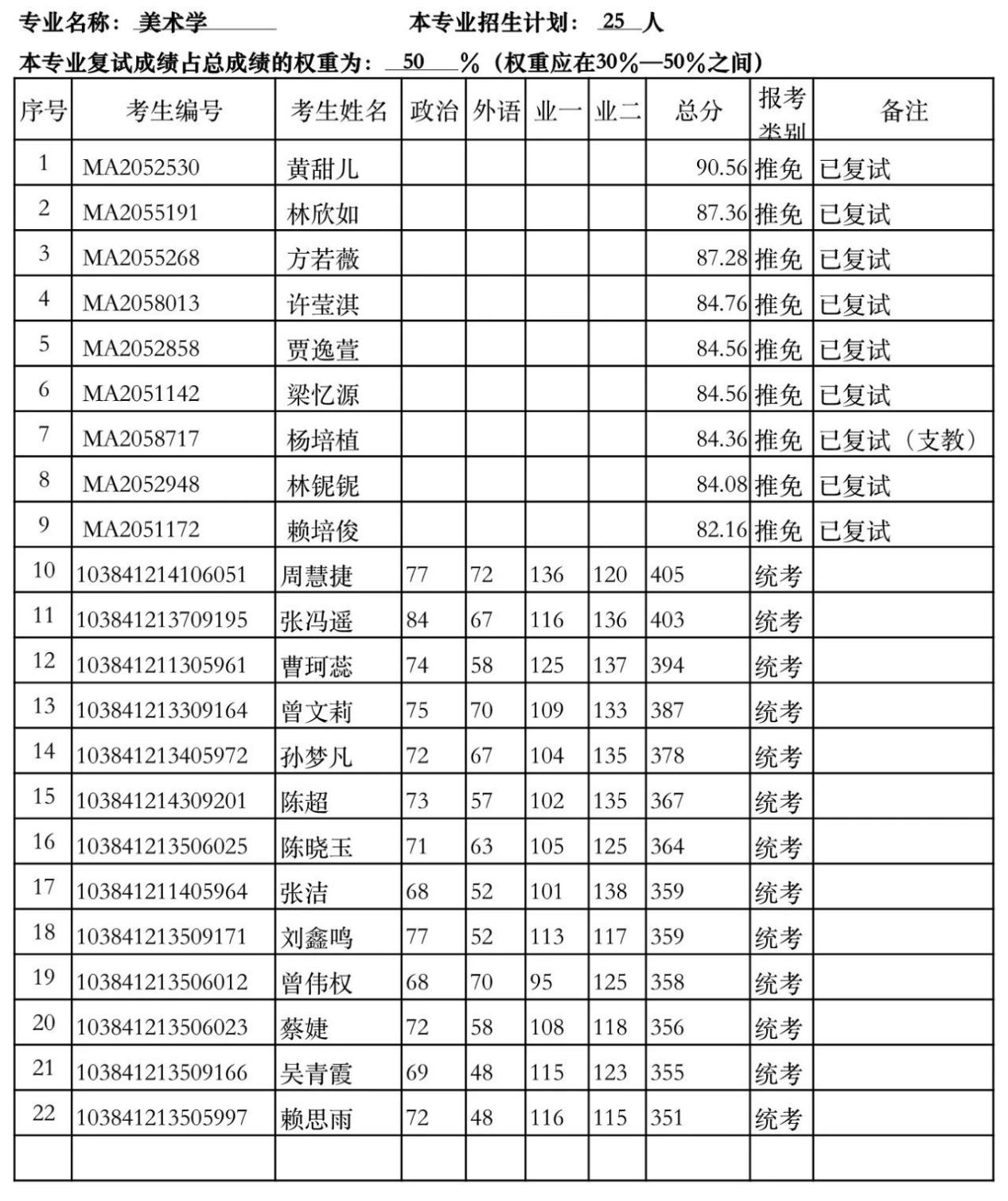 1.根据招生计划,按各专业(或方向)实际情况和考生总成绩(总成绩=初试成绩÷5x50%+复试成绩(百分制)x50%)并结合考生思想政治表现、业务素质以及身体健康状况等因素,择优确定拟录取名单,2021年厦门大学艺术学院拟招收17名美术学研究生(统考),其中绘画11名,理论6名(视觉艺术史及理论研究:3名;艺术管理与策展研究:3名)