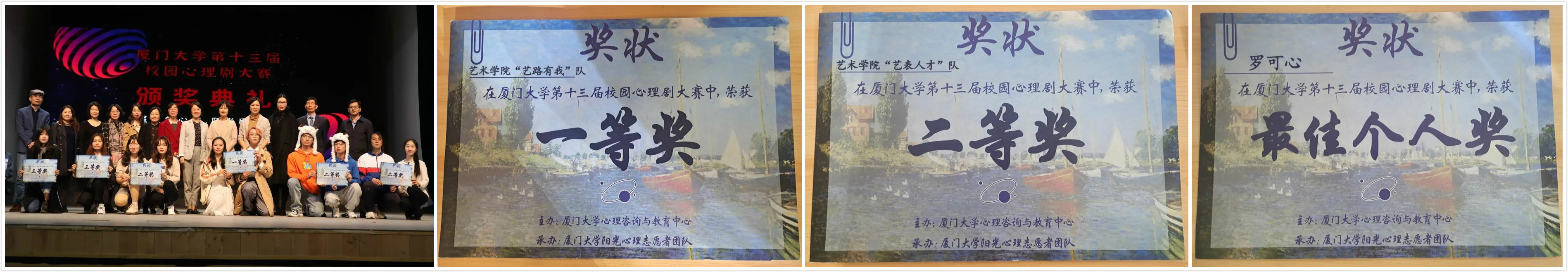 2020年12月5日,第十三届厦门大学校园心理剧大赛正式落下帷幕。艺术学院两支队伍囊括了一等奖、二等奖与最佳个人奖的三项奖项。其中艺路有我队以90.30分的成绩取得了大赛一等奖;艺表人才队以88.29分的成绩取得了大赛二等奖;罗可心(思雨饰演者)凭借个人的出色表演荣获了最佳个人奖。
