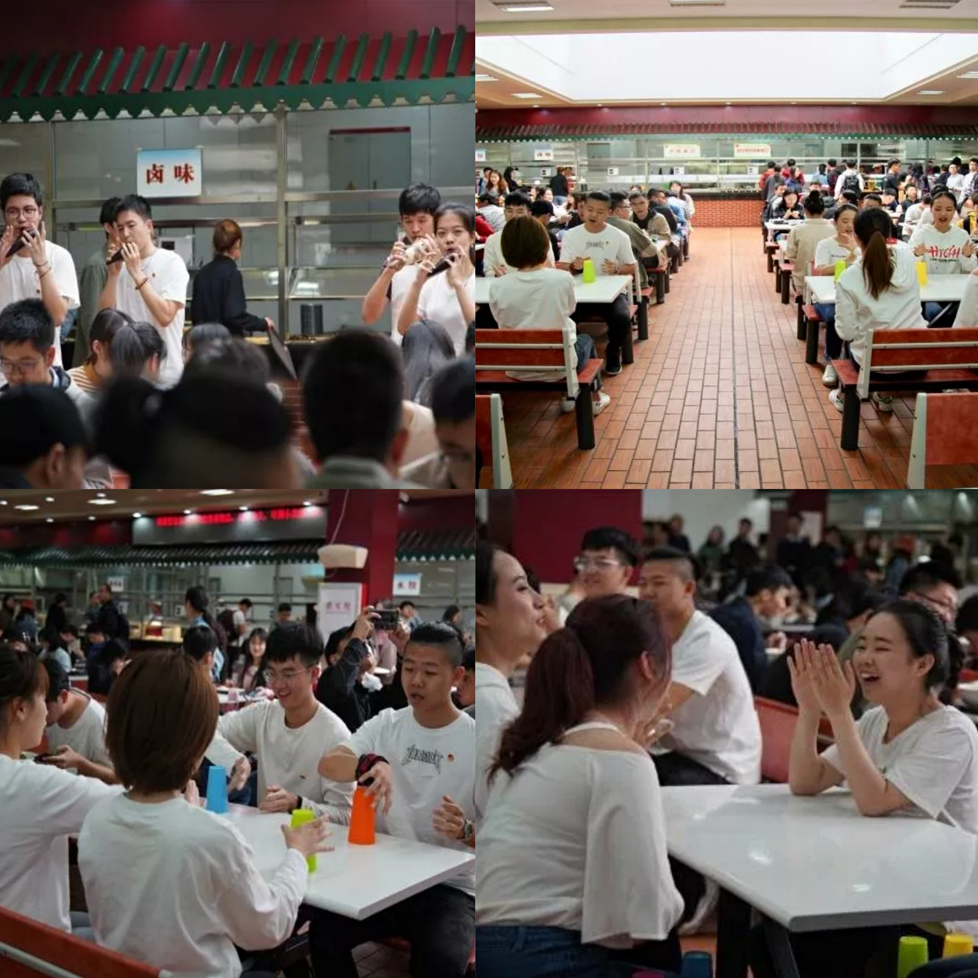 当天上午最后一节课结束,师生们在食堂用餐的时间。一段轻快的乐声忽然从角落里的音响跃出。9名同学手持陶笛迈着轻快的步伐从人群中走来,吹奏起了陶笛曲《幻化成风》,活泼可爱的旋律引起了大家的注意,许多原本低头看手机的人们都纷纷抬起了头,同学们随着乐句穿进了餐厅的一条条过道,一边吹奏,一边与用餐的同学们互动,这时正在用餐的师生们才反应过来,纷纷笑着拿起手机拍照。《幻化成风》乐音刚落,“埋伏”在餐厅中央的同学们开始通过杯子舞的方式,打着节奏唱起那首见证抗战敌后的生产奇迹的《南泥湾》:“到处是庄稼呀,遍地是牛羊。”