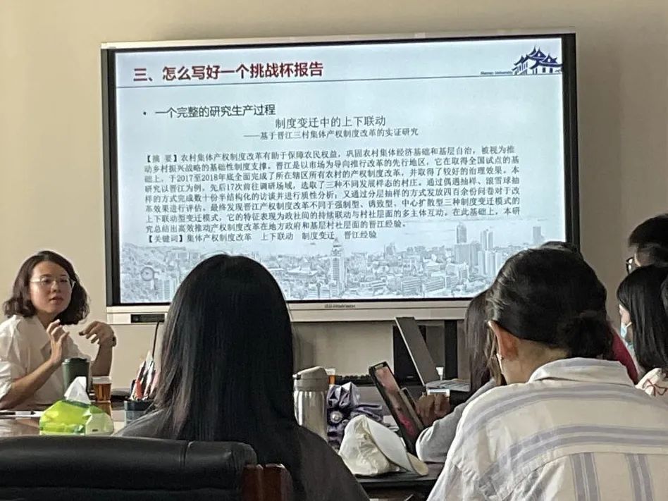 最后,林雪霏老师就如何写好一个挑战杯报告进行了阐述,从确定选题到论文的写作和答辩,林老师结合往年比赛的经历生动的再现了“挑战杯”比赛的全过程,同学们仿佛身临其境,大大削弱了对比赛的陌生感。