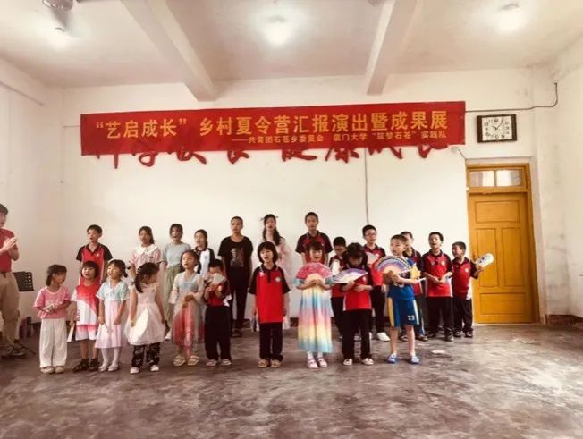 “艺启成长”乡村夏令营汇报演出暨成果展开舞蹈始,由两名夏令营营员与实践队成员共同主持。营员们与厦门大学学生共同进行了舞蹈、歌曲、朗诵表演以及美术作品走秀,展示了孩子们这七天来的优异表现和优秀成果。