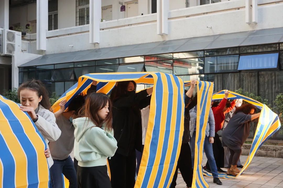 开场戏是“高山流水”,7人一组传递乒乓,培养团队精神和默契合作。